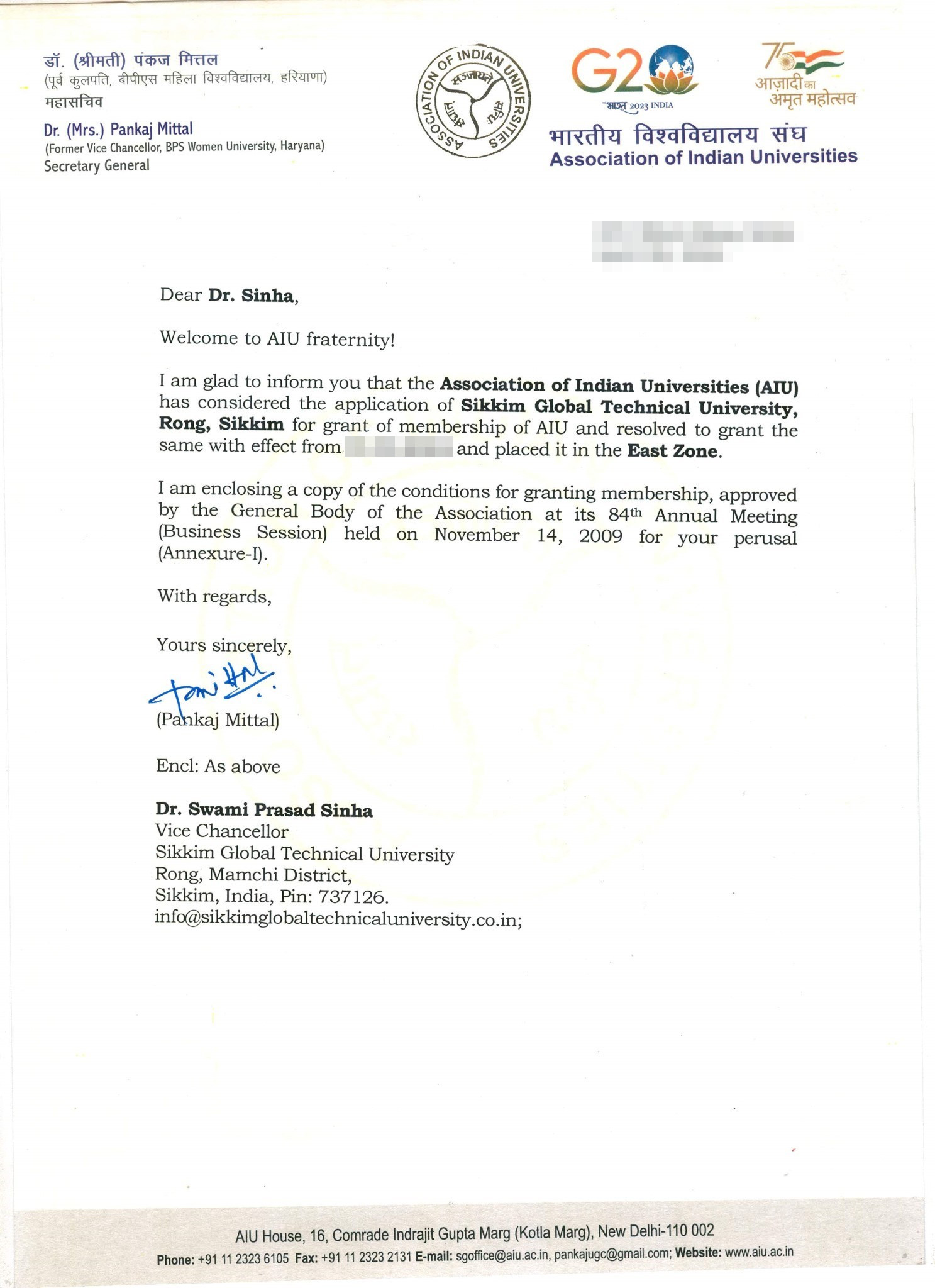 Sikkim Global Technical University is a member of the Association of Indian Universities (AIU), an Apex Inter-University Organization engaged in the growth and development of Higher Education.